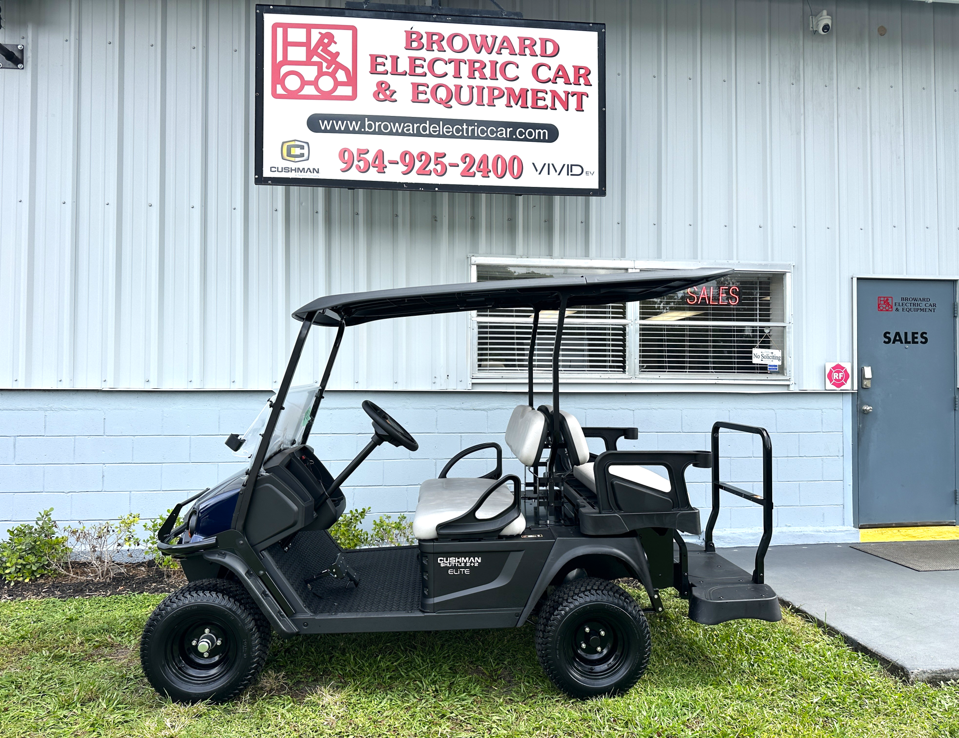 CUSHMAN 2026 SHUTTLE 2+2 ELITE 2.2 LIFTED MODEL #10002814 NEW Features: Batteries: Single Pack Lithium Li-Ion 56.7 V., reverse warning, speed controller: 300A. AC, charger: world elite, lights: halogen head, horn, SOC meter, DC-DC Converter, frame: welded steel w/pc, suspension front & rear: leaf spring w/shock, brakes: rear mechanical drum & auto park brake, RFS rear facing fold down seat, tires: K500 20×8-10 turf design w/black steel, seat cap: 4/P, speed: 16.5 mph +/- .5, FACTORY LIMITED WARRANTY: 2 Years Parts & Labor, Lithium Battery 5 Years