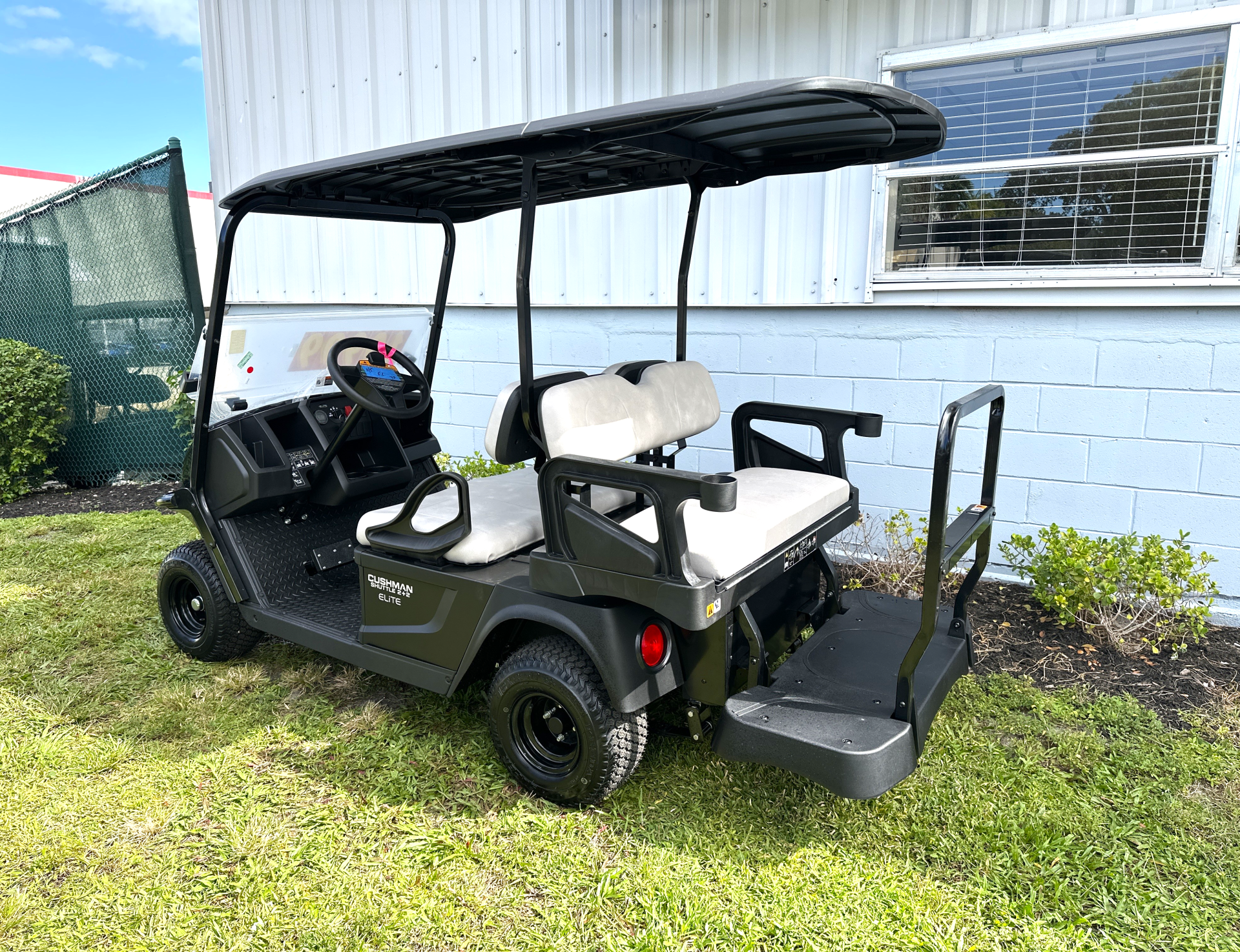 CUSHMAN 2026 SHUTTLE 2+2 ELITE 2.2 MODEL #10002813 NEW Features: Batteries: Single Pack Lithium Li-Ion 56.7 V., reverse warning, speed controller: 300A. AC, charger: world elite, lights: halogen head, horn, SOC meter, DC-DC Converter, frame: welded steel w/pc, suspension front & rear: leaf spring w/shock, brakes: rear mechanical drum & auto park brake, RFS rear facing fold down seat, tires: 18×8.50-8 kenda super turf on black wheel, seat cap: 4/P, speed: 16.5 mph +/- .5, FACTORY LIMITED WARRANTY: 2 Years Parts & Labor, Lithium Battery 5 Years