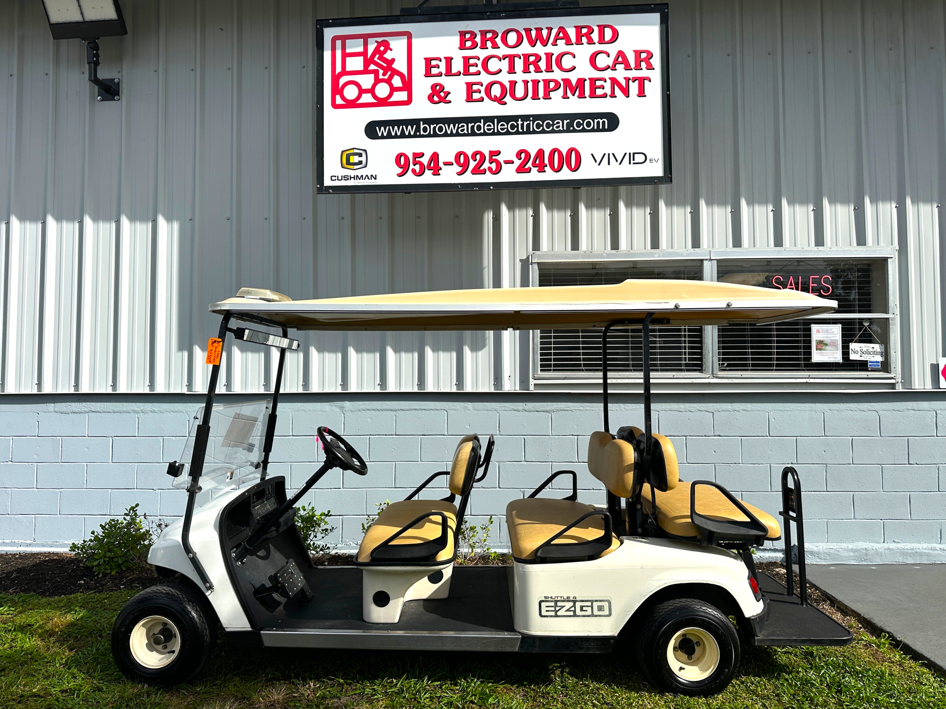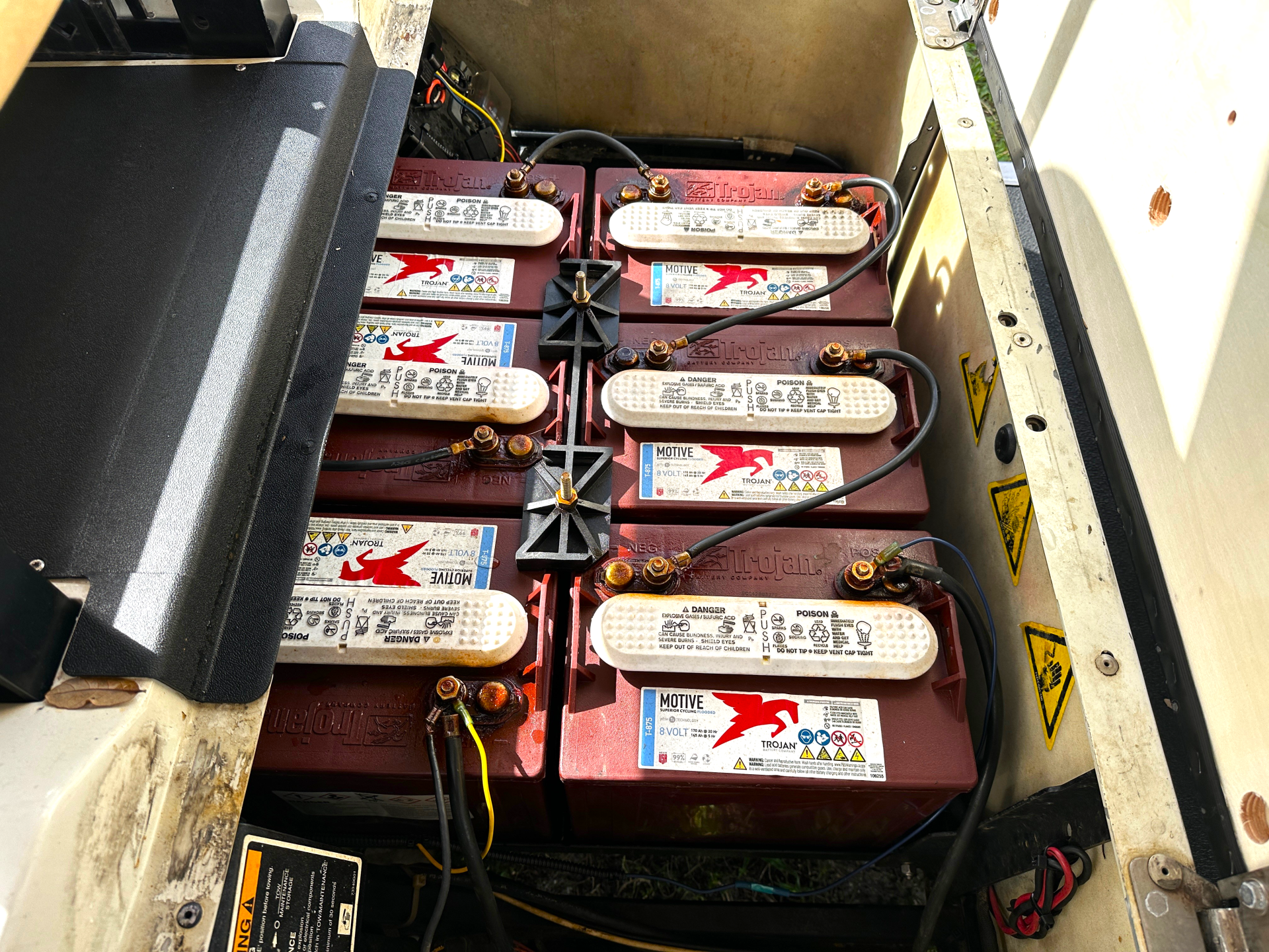 Includes Used: Motor 48 V. DC, H.P: 15.2hp (11.3 kW) at 1600 rpm, Batteries: 8- 6V Batteries, Charger: 48 V Used, 120 VAC, UL & CSA, Speed Controller: 400 A. Precision Drive System (PDS), Frame: Welded Steel w/DuraShield Coating, Body: Injected Molded TPO /Steel, Front & Rear Suspension: Leaf Springs w/Shocks, Brakes: Rear Wheel Mech. Drum, Tires: 18X8.50-8 Used, Load Cap.: 1200lb, Seating Cap: 6 Person, Ground Speed: 13mph +/- 0.5mph.