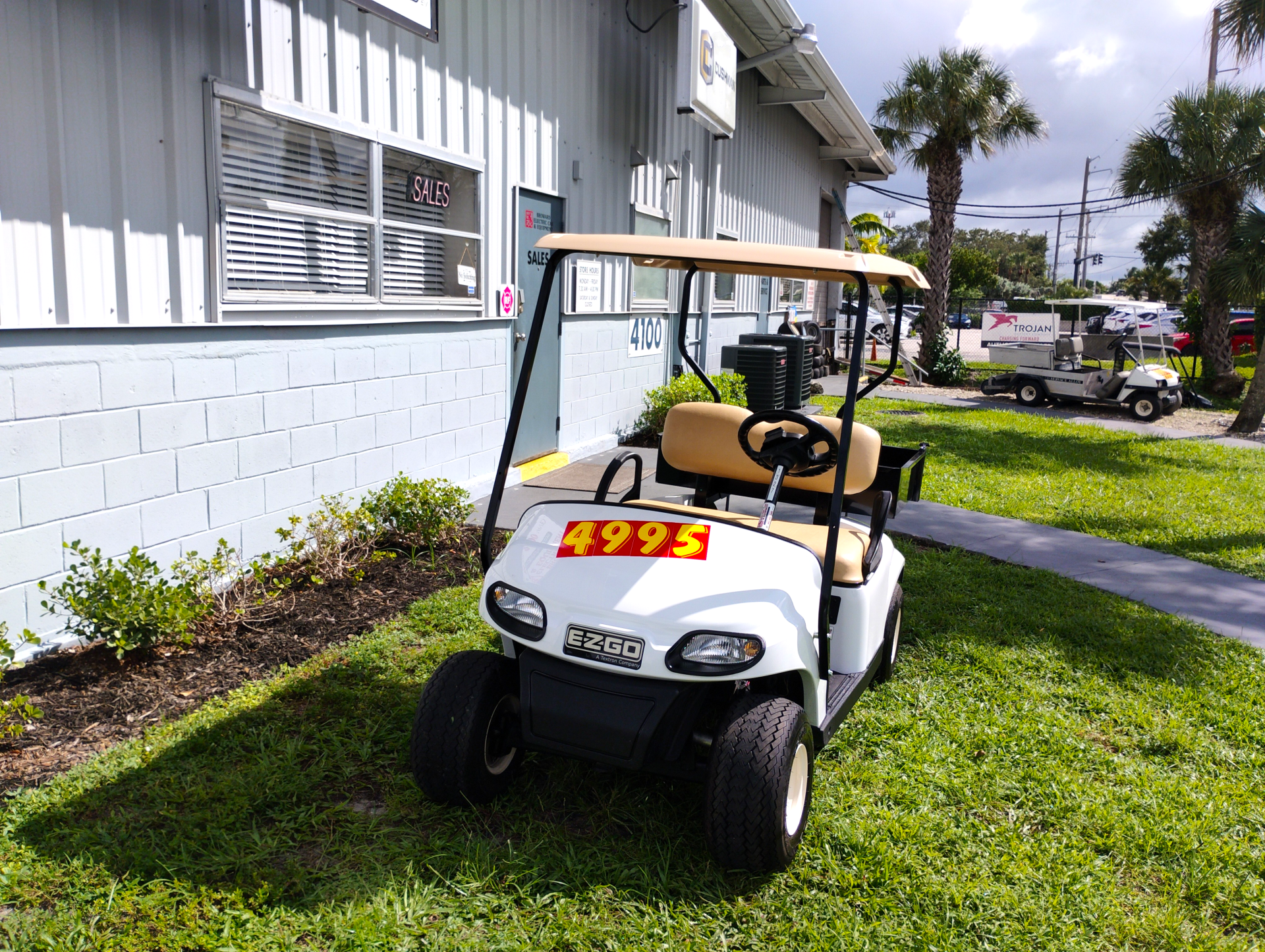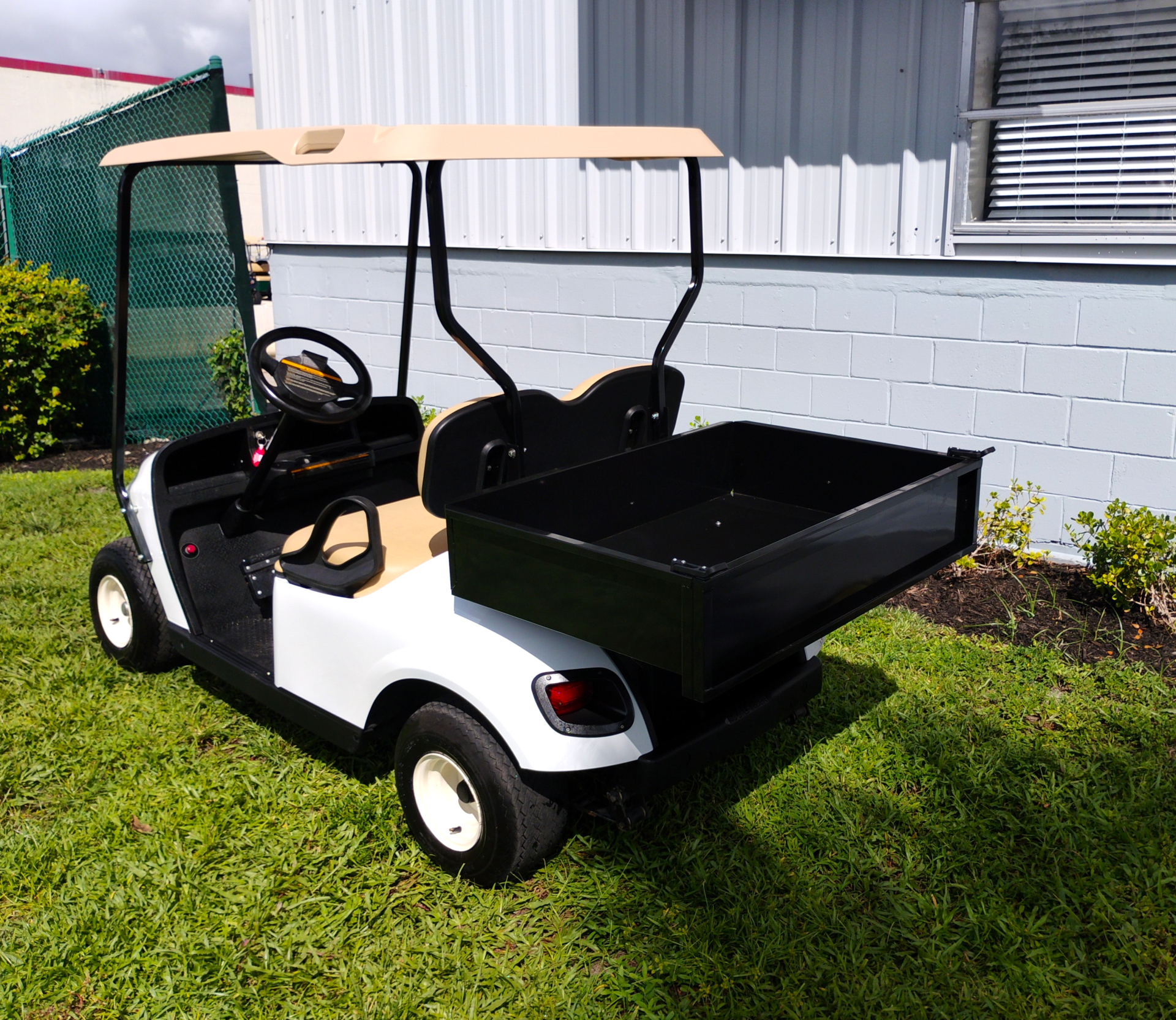 EZGO 2019 TXT Freedom 48V UTILITY Features: motor 48 Volt DC Unit, 250A SS speed controller, anti-roll back, batteries: 6- 8V used, used charger 48V, override switch for towing & maintenance, Lights: head-tail-brake, horn, SOC meter, front & rear suspension: leaf spring w/shocks, brakes: rear mechanical drum, frame: steel w/p.c. molded body, tires 18X8.50X8 used street design Seating cap 2/P, Speed 14.5mph +/- 0.5. Vehicle Color: WHITE, Seat Color: TAN. BEC LIMITED WARRANTY: 90- Day Parts and Labor